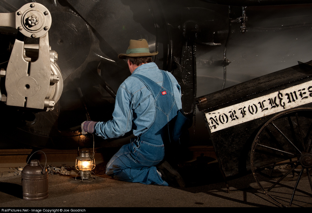 Late Night at Shaffers crossing and a N&W engine machanic takes a close look at 1218's running gear. Thanks to Pete Lerro and crew for a Great photo shoot