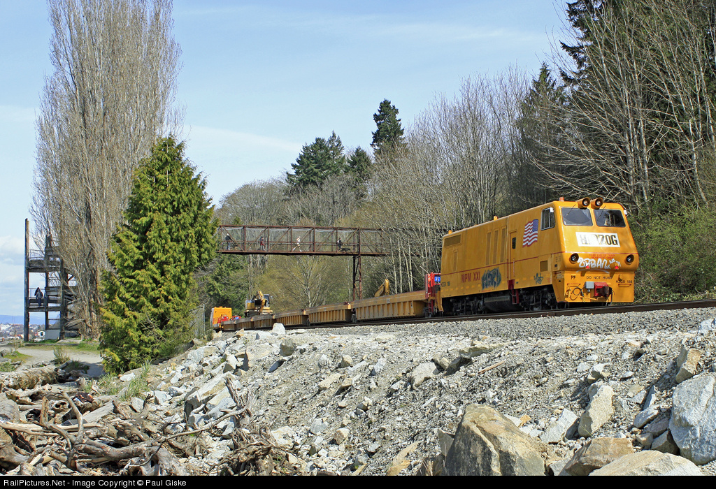 | A Herzog work train pauses while a backhoe repositions itself on top of the gondolas during a trenching project for new fiber optic cable installation at Howarth Park in Everett, WA. This effort is just a portion of the system-wide upgrade for signal/communications on the BNSF's Scenic Sub. |