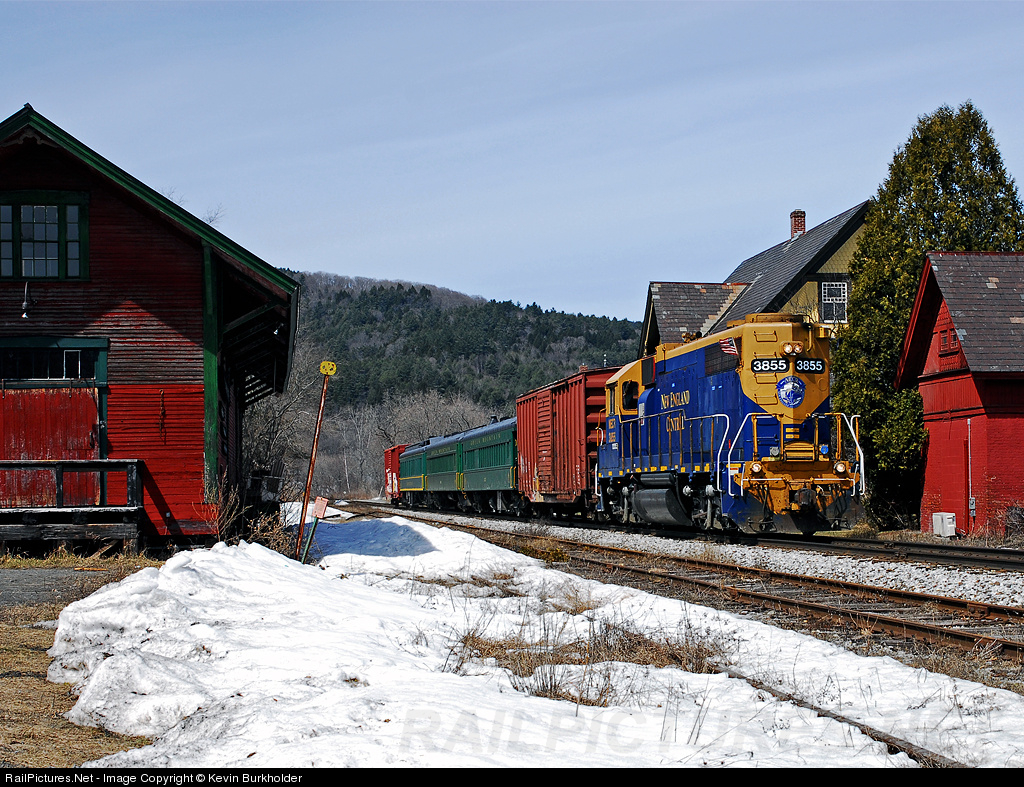 A New England Central passenger extra is deadheading Green Mountain Railroad passenger equipment and two spacer boxcars from Montpelier Jct., VT to Bellows Falls, NH and back to the GMRC, following a legislative dinner aboard the train earlier in the week. NECR GP38 3855 has the US flag and POW flag flying on the long hood of the locomotive - compliments of engineer Joe Dufresne - as it passes through historic little South Royalton, VT.