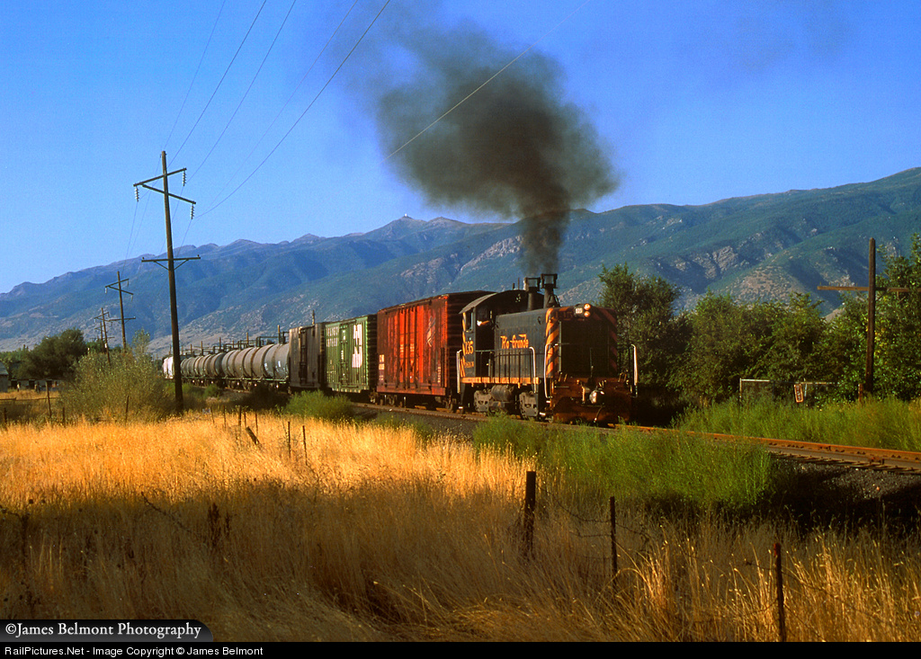 Smoky old yard goat last spotted wandering through fields of gold! In reality, it's just an old Rio Grande SW1200, towing a long train of box cars and petroleum tankers along the former D&RGW Ogden Main at Woods Cross, Utah. In 1985, the high iron of Subdivision 7 became a five mile spur that dead ended at the Phillips 66 refinery. SP Management thought nothing of sending a light duty yard goat from the Fourth South yard in downtown Salt Lake City to the oil refineries 10 miles to the north. D&RGW 135 is dragging it's inbound train at milepost 753, which is measured from Denver, Colorado via Pueblo and Tennessee Pass. This image was scanned from a 35mm Fujichrome Velvia transparency.