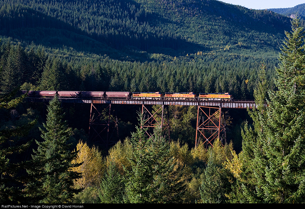 | A trio of clean Dash 9s step across High Bridge as they lead the charge of an empty grain train up the 2.2% grade of Stampede Pass on a glorious autumn morning. Unfortunately, the massiveness of this NP-built viaduct spanning the Green River valley has become obscured over the years by continual growth of the forest -- Mother Nature never rests. |