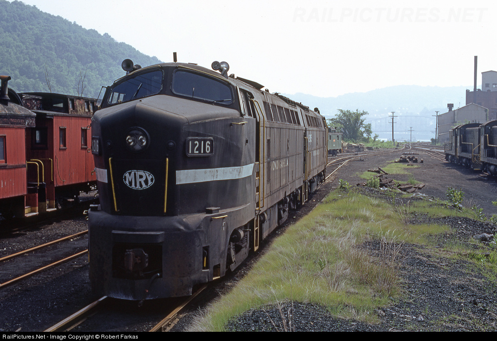 It's July 1, 1972, and this is the Monongahela Railway yard. Baldwin RF-16A "Sharks" 1216 and 1205 are here to greet us. Old work equipment and cabooses are to the left, and to the right are Baldwin switchers. In the background is the river and the bridge over it while hidden in the fog is Brownsville itself. It's a peaceful shot snatched from the mists of time.