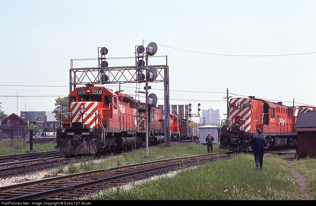 A westbound CP manifest was flying flags as it passed through West Toronto interlocking on May 30, 1980, led by SD40 No. 5508. RSD-17 No. 8921, the "Empress of Agincourt," was patiently waiting to follow the train into Lambton Yard to to get an outbound transfer.