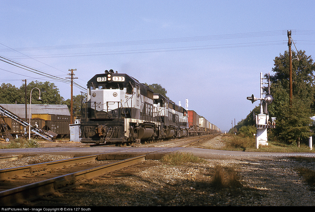 TOFC business on the RF&P really started to mushroom in the early 1970s, much in part because of UPS. The piggyback ramp at Potomac Yard became increasingly important, with most of the southbound traffic originating there. Solid TOFC hotshot No. 175 was laden with a heavy train of "Florida Points" traffic as it pounded through Doswell in Sept. 1973, led by GP35 No. 133. As an aside, most of the industry in Doswell was forest products related. The wood chip operation to the left was just one example. That operation was switched by C&O and the traffic was destined to the huge Westvaco paper mill at Covington, VA.