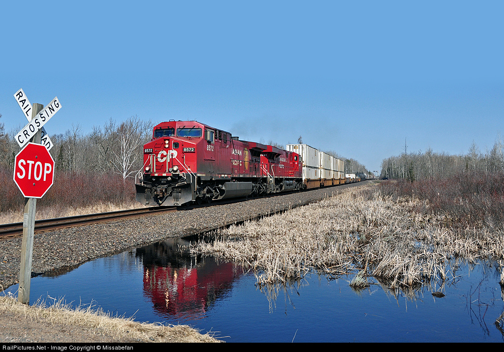 | Due to flooding in other parts of the state, CP is detouring some of it's trains on the CN. Here is CP 8572 in charge of one of those detours as they run track speed southbound down the CN Rainy Subdivision through Peary. |
