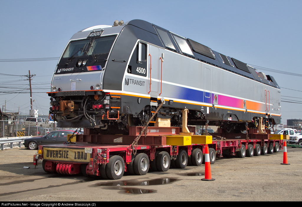 | NJT 4500 has yet to touch American rails as it sits on a trailer in Port Newark. The 4500 is the second of NJT's new dual mode locomotive to be delivered. NJT 4501 is currently in Pueblo, CO undergoing testing. Photo taken on private property with permission. |
