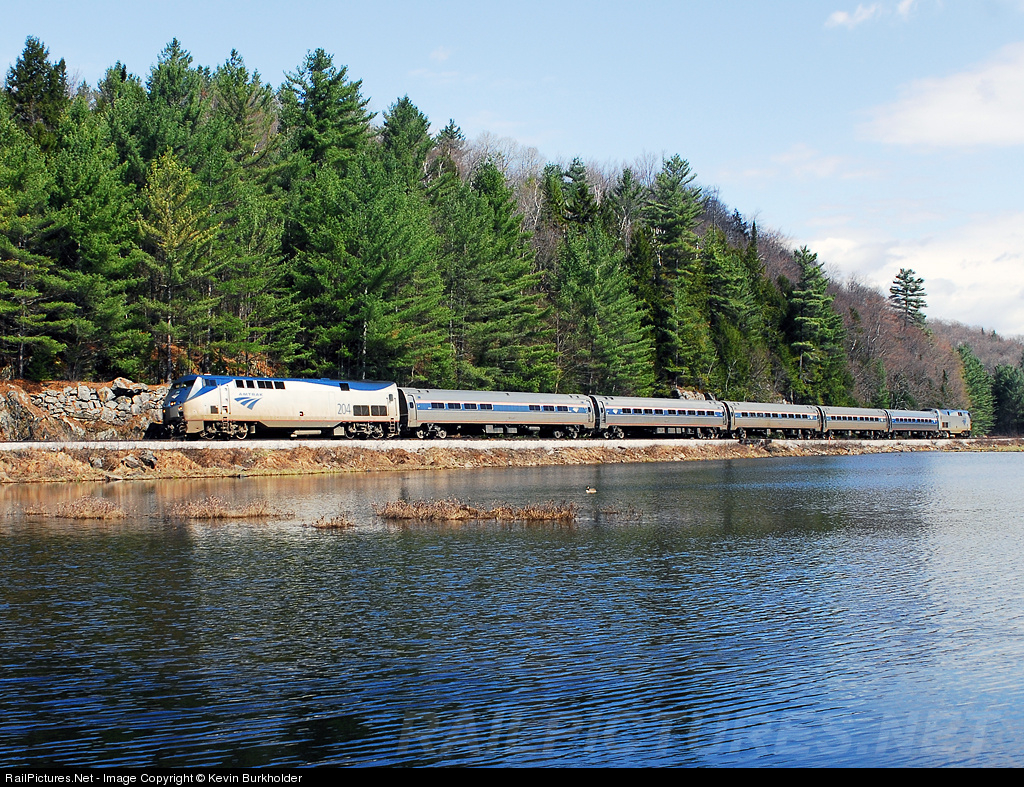 | Amtrak's southbound Vermonter train 55 is seen rolling through pristine Vermont wilderness and Muddy Pond - complete with a Canada goose - with P42DCs 204 and 102 bracketing the typical 5-car Amfleet consist. |