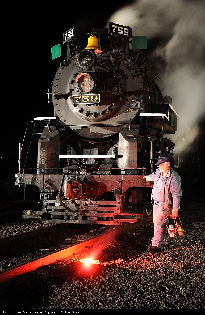 | NKP 759's breakman prepares to couple. This scene recreated thanks to Pete Lerro and Steve Barry during steam towns spring training. This recreation was special to me as 759 was the first locomotive my father took me to see. I was able to re live a childhood memory thanks to those mentioned above and my wife Crystal. |