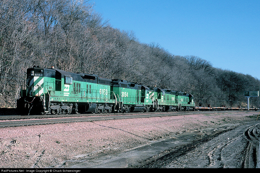 Despite massive traffic increases BN was able to retire Alcos, early GE's, EMD covered wagons, and even more modern units like SD45's,F45's and U33C's during the 80's. But as the 90's rolled around some pretty old 1st generation EMD's were still out and about with a lot of years of work left in them. Here's is one such set as 6183,2054,6193 and 6141 depart Omaha eastbound with a string of empty TOFC/COFC flats.