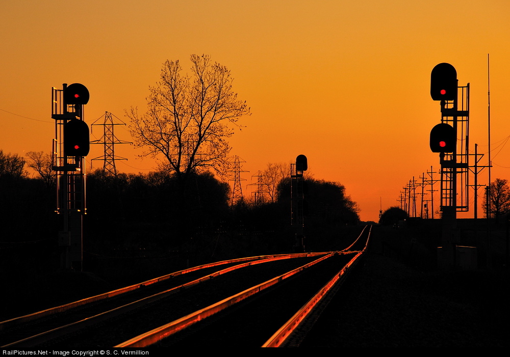 Sunset over NS's Dayton District. These Safetrans signals protect the west end of Brookes Siding.