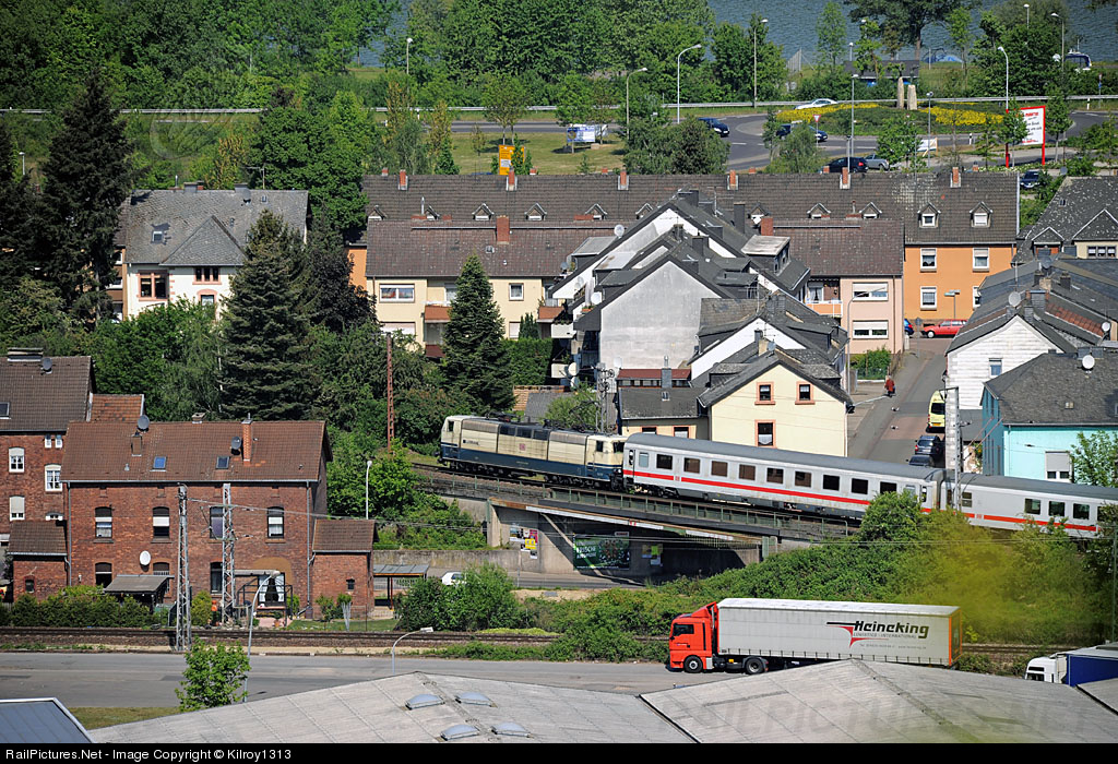 | InterCity Train passes with 181.2 series loco "Lorraine" passes Konz towards the steel railroad bridge over the Mosel river. |