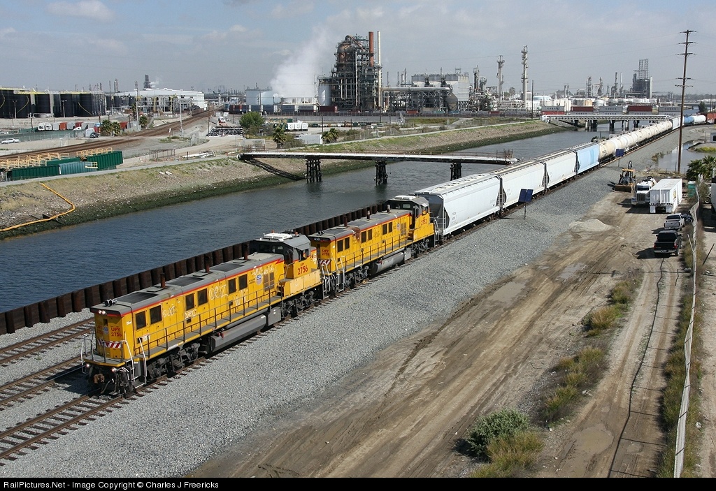 | Union Pacific's "Dolores Local" shoves up the Manuel Sub out of Mead Yard. Once clear of the junction, it will pull onto the Long Beach Sub (the bridge over the Dominguez Channel by the Tesero Refinery) on its way to Dolores Yard and the industries that surround it. |