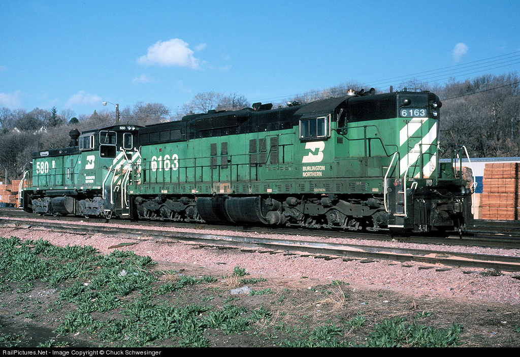 | BN switch power in the form of 6163,580 idle away at the BN yard in Omaha. The SD9's could be found in all kinds of service at the time, probably everything except coal and maybe that even happened as they were very versatile units. |