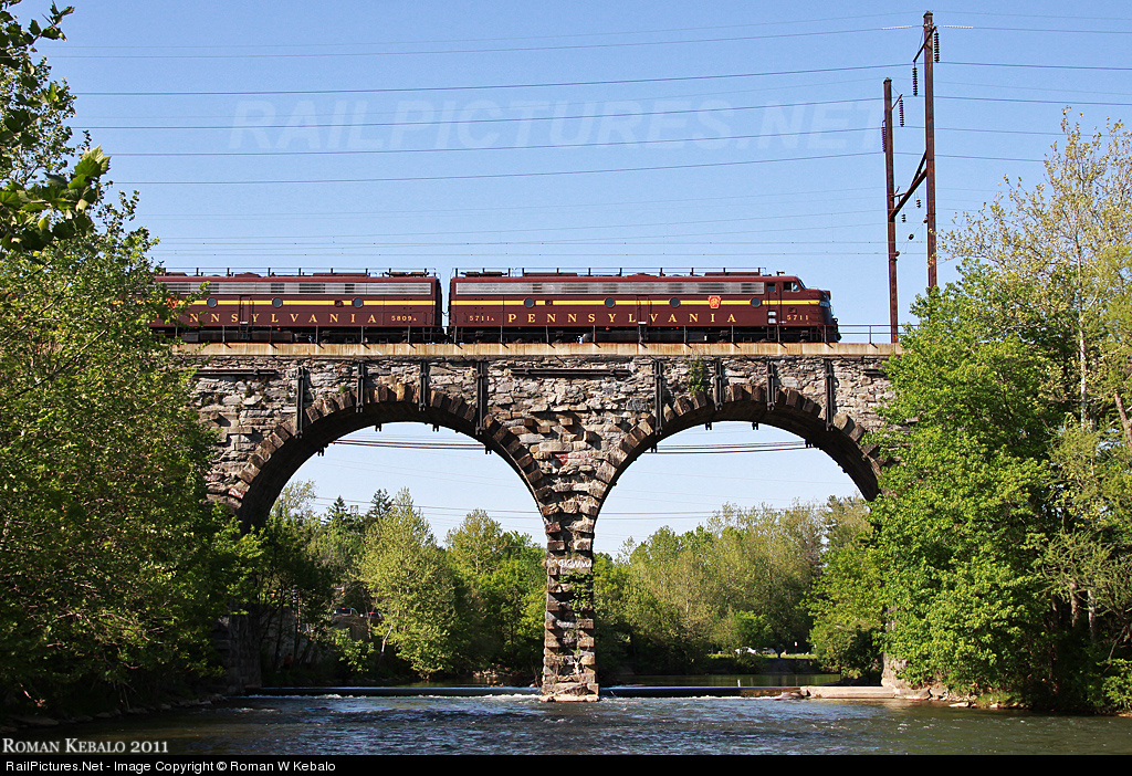 | The passenger mainline of the Pennsylvania Railroad. Two PRR E8s glide over the Conestoga River keystone bridge on their home stretch back to Philadelphia. As built in 1887, this bridge's main characteristic is still the protruding stones which would have facilitated widening the bridge to four tracks. This was one of the only stretches on the entire PRR mainline that remained only two tracks wide... |