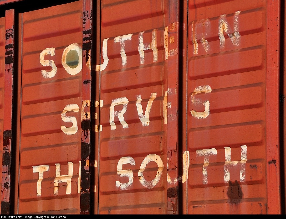| Southern Serves the South More than just a slogan; this was how the Southern Railway operated. From modifying cars to meet customer needs, or becoming the first railroad to introduce unit trains Southern was always at the forefront of innovative railroading. This slogan first began appearing on boxcars in the early 60s on the right hand side of the boxcar and would be a part of that railroad's boxcar paint scheme up until the 1983. Other notable Southern slogans were “Gives a Green Light to Innovation” or “Super Cushion Service”. |