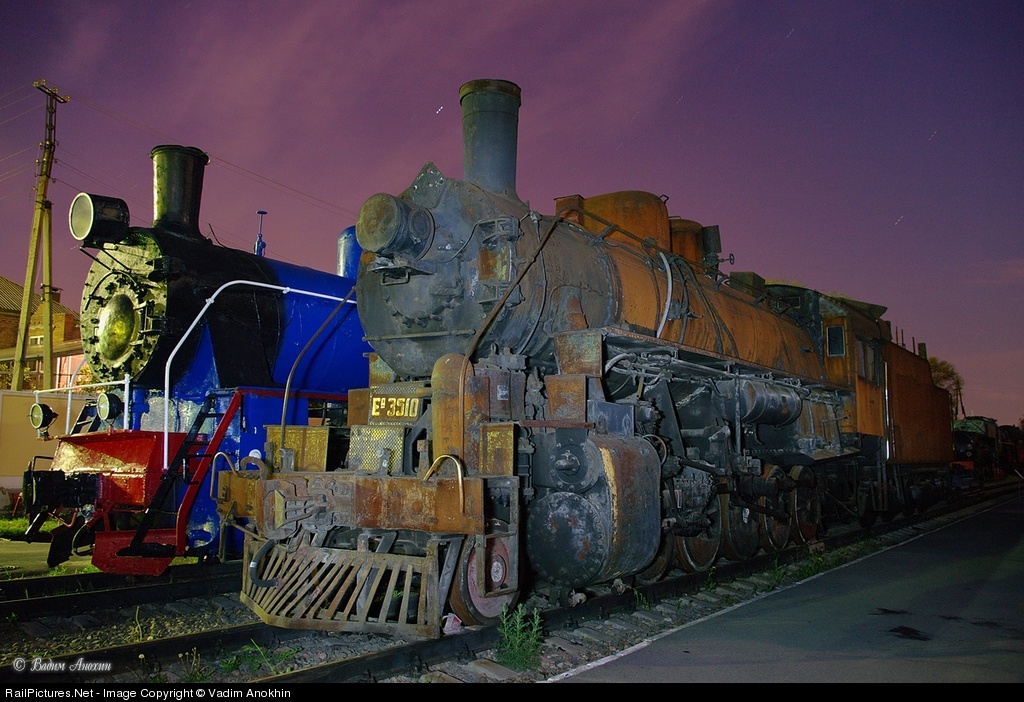Steam locomotives Ea-3510 in Railway museum at night. Multiexposure mode, 3 frame * 30 sec, LED-lighter.