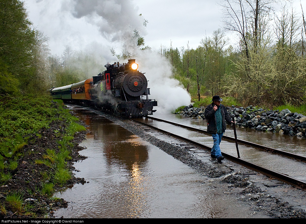 Walking on water: Wielding a "calibrated ballast density meter," fellow RP contributor Bob Harbison inspects the over-topped track ahead of Polson #70 on a rainy Sunday evening. Passengers on this oft-delayed excursion train from Tacoma to not-quite-Eatonville lean out of the open-sided passenger car to gaze at the spectacle of the train tip-toeing down the inundated track. Nearly an inch of rain was dumped upon the Cascade foothills over the preceding 24 hours, sending Lake Kapowsin over its banks and, utterly ignoring the railroad's levee, overflowing the Tacoma Rail Mountain Division mainline south of Kapowsin. In addition to the flooding, the train also encountered and conquered two downed trees before finally being stopped by a landslide only a couple miles north of its intended Eatonville destination. My compliments to the MRSR and TRMW crews for doing an outstanding job keeping this train moving and overcoming almost all the obstacles thrown at it by Mother Nature; it sure made for an enjoyable afternoon of photography.