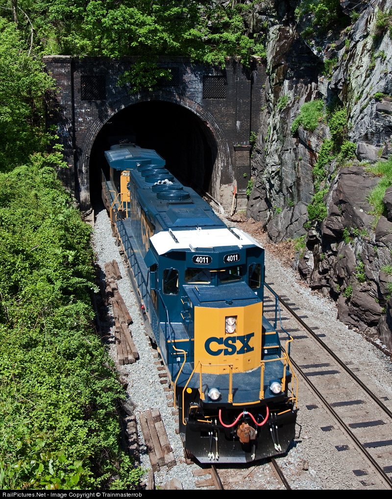 | One of CSX's ugly duckling SD40-3's lead a autorack train out of the east portal of Harpers Ferry Tunnel. Originally built in 1892, the tunnel was lengthen in 1896 by constructing brick portals to protect trains from falling rocks. |