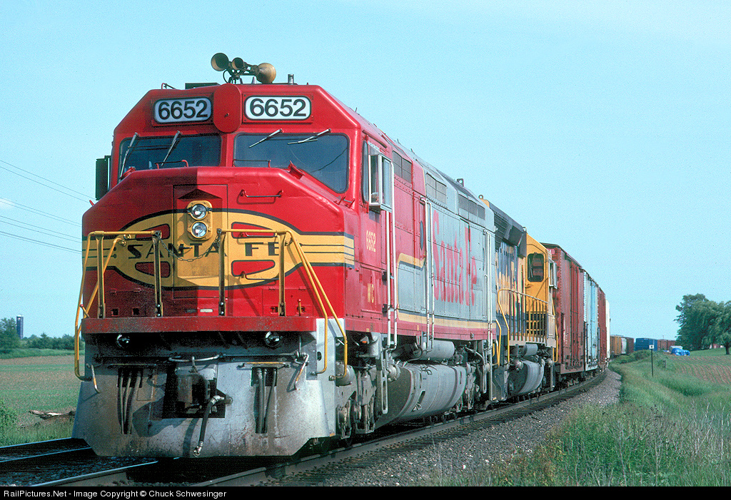 The only FP45 that WC bought managed to run around in a few different looks before it was finally given a full repaint. It first operated in full Santa Fe paint and number, then it was ran in this scheme with full Santa Fe paint but renumbered and with a small WC on the lower cab. After some confusion the big Santa Fe on the side was covered over with solid red, somewhat like the Soo's "bandit" treatment of Milwaukee Road units. Then it was given full WC paint. Here a still good looking 6652 and 5388 lead a extra train 41 approaching the downgrade of Byron Hill.