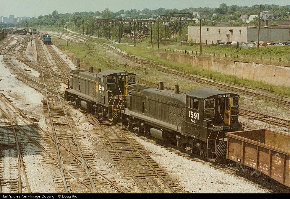 | A P&LE Switch Job rolls through the Center St. interlocking; in the distance an eastbound Conrail freight waits for it's turn to cross. |