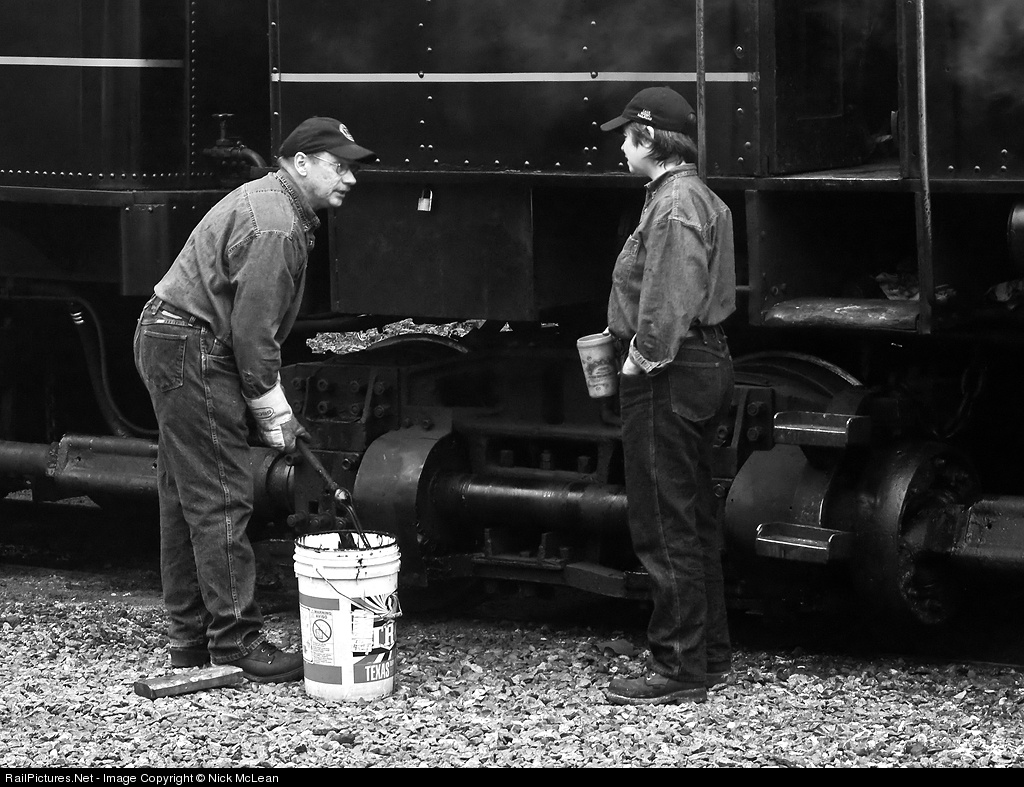 The Cass Crew: Here we see Dirk and Amy - the engineer and firewoman of Shay 11 - going out their morning rituals. Dirk seems to be imparting a little wisdom of greasing the gears which is accomplished with a metal rod dipped in a grease bucket - a tried and true technology.