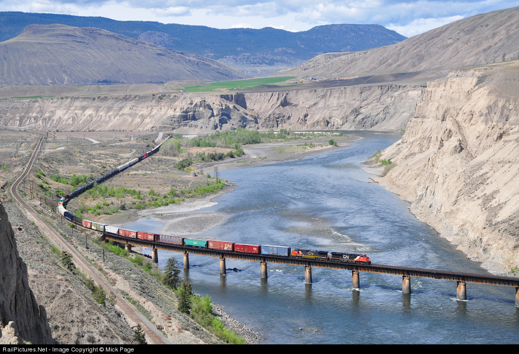 162 car eastbound manifest crosses the Thompson River for the second time since leaving Ashcroft.
