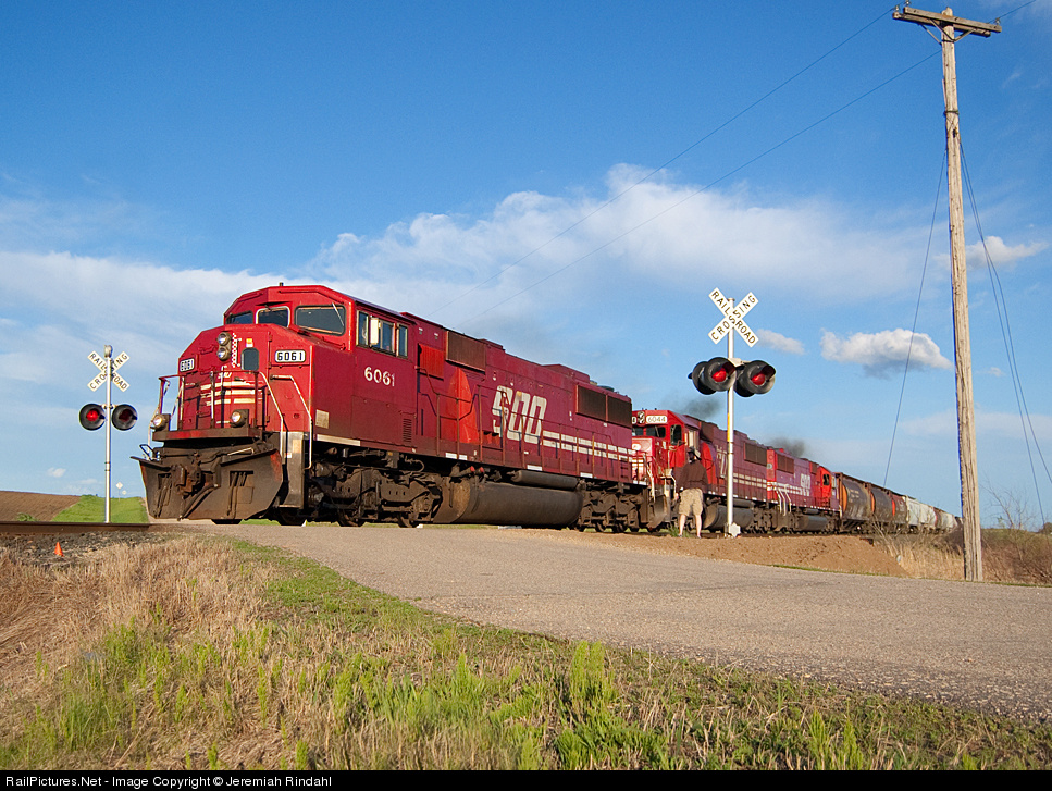 The SOO 6061, one of four active SD60M's, splits the crossing signals just east of Sedan, MN. They already have yarding instructions at Glenwood yard. In less than 12 hours, this train would be on its way north with 1000 more feet of train, and one less unit.
