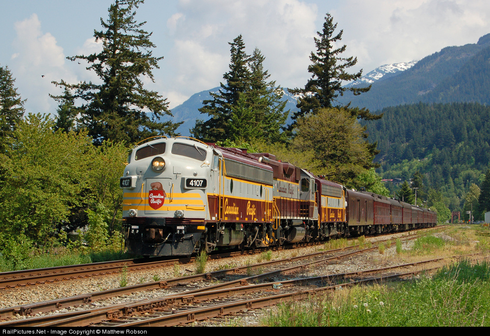 | The Royal Canadian Pacific led by FP9 4107, GP 38-2 3084 and FP9 4106 highball the town of Hope as they travel west on Canadian National’s Yale Sub. A freighting moment occurred a few miles west of this location as the train hit a fallen tree across the tracks. At first the crew thought they were on the ground, but fortunately there was no damage to the train and everybody on board was unharmed. |