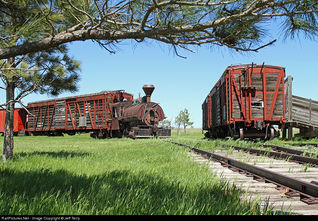 Another lazy summer afternoon at the Murdo, South Dakota "1880 Town." The locomotive is former Great Western Sugar Co. No. 7, which was built new for GW in August 1938 as Davenport C/N 2267. It is the former Gering, Nebraska, engine and is displayed with a former NP stock car and CB&Q caboose. The 0-4-0T sports a diamond stack which was added in a vain attempt to make it appear as a locomotive of the 1880 era, which fools the tourists but not the railfans.