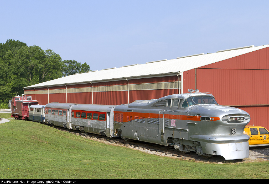 "Built to save the business", the EMD Aerotrain came to be in 1955. Inspired by the style of the day and the buses of the GM division, the train even was complete with Chevy Nomad tail fins on the last car. Lightweight with air ride suspension and a single axle, the ride was harsh and maintenance was a nightmare. Still, a wild concept at the time, wild enough that 2 full sets were built (and a third engine for Rock Island's own Talgo set). The PRR ran these across Horseshoe Curve en route to Pittsburgh from NY while the NYC ran them between Chicago and Cleveland. Even the AT&SF tested these, as well as the UP which ran them from LA to LV. Hard to believe so few pictures exist. Two sets survived, one in St Louis, the other at the National Transportation Museum in Green Bay, WI. Oddly, the tail car is absent from both sets. This is because the tail cars were bascially assemblies that were added to standard coach bodies. The Aerotrain tail cars were not saved because they were modified to standard coaches when the Rock Island put them in commuter service.