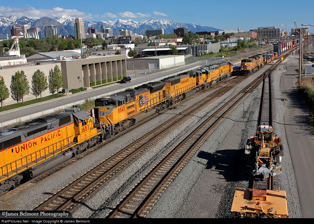 | UP's YSC22R switch job meets a Long Beach, CA to Global 2, IL stacker at the west end of North Yard in Salt Lake City. |