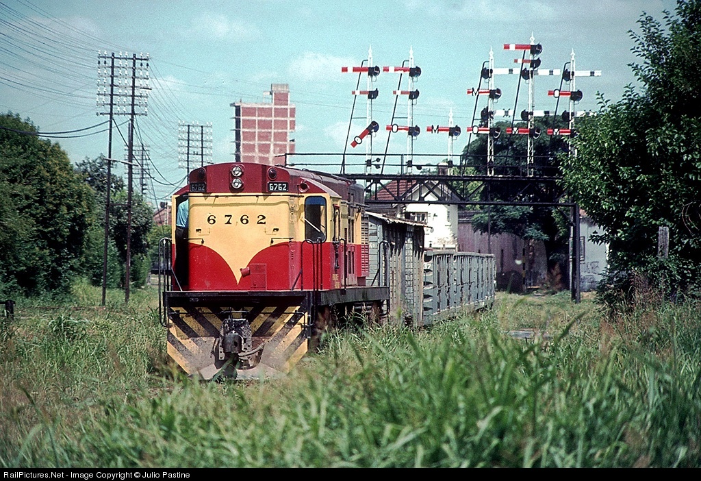 General Belgrano Railroad's ALCo. RSD35 #6762 is about to finish its ride at the back of a freight train entering Alta Córdoba Station by the west, with Alta Córdoba West Tower in the background. The signal bridge protects both eastbound and westbound train movements through the two tracks giving access to either the yard trackage (to the left of the picture) or the passenger station platforms. Summertime heat and humidity are evident in the high-grown weed covering the tracks and tree foliage in deep-green full blossom.