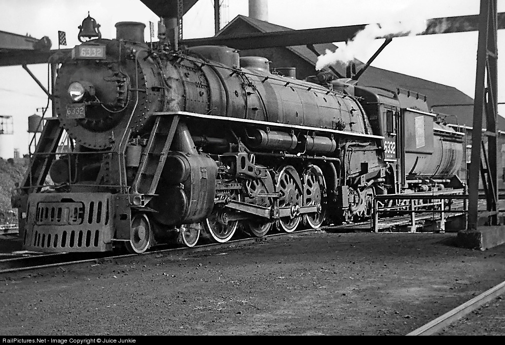 Elsdon Yard, on Chicago's southwest side, had a roundhouse and service facilities for Grand Trunk Western steam power until the end of the steam era. We visited the yard and found a good number of live locomotives at the roundhouse and working the yard. Grand Trunk Western 6332, Class U-3-b, was built in 1942 by ALCO. GTW 6332 is shown at the ash pit adjacent to the roundhouse. After she has her fire cleaned she will be coaled, her tank filled with water, and will be ready for her next call to service.