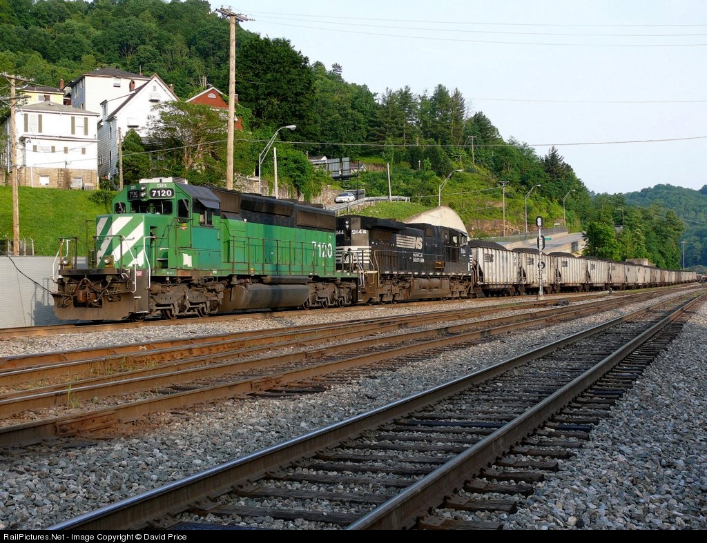 Ex BN SD40-2 on the lead of a NS unit train awaiting a crew in downtown Williamson just outside the yard.