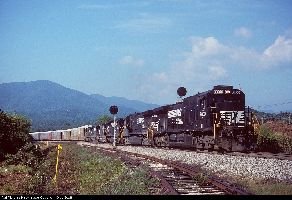 NS 195 heads north with empty racks from the car lot at Walkertown, NC. The excessive power (two C40-9s, C39-8, GP38AC, C36-7, and another C40-9) likely includes engines returning to Roanoke off a Belews Creek coal train or grain train from Winston-Salem. The old N&W signals (RW 11.0 and 11.1) came down last year. Starkey, with its mountain scenery, has always been high on my list of favorite locations - and it's just down right soulful up there.
