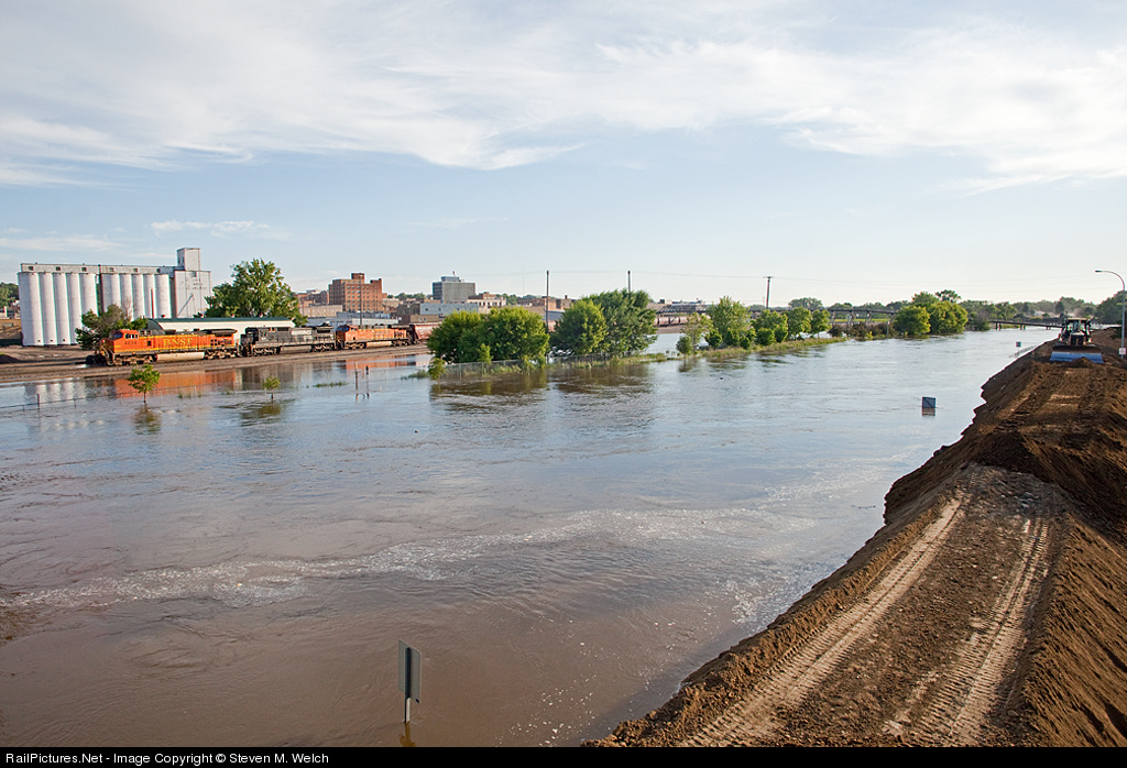 "The Mouse that Roared" BNSF 4838 East leads the last train to roll through downtown Minot before MOW took the second mainline out of service this afternoon, while the National Guard frantically continues to build emergency secondary levees to prevent the extremely swollen Souris/Mouse (Souris is French for Mouse) River from destroying more structures. While standing on the 3rd St NW overpass, the mood was definitely very eerie but at the same time, there was a sense of panic with everyone who walked by, even the members of the National Guard... The flood of 2011 has already broken the record for the 1969 flood, and the river is expected to rise another 11 feet by Saturday, per the National Weather Service. Due to the flooding, BNSF is detouring Eastbound trains via the ex-NP line through Glendive, MT Mandan, ND and to Dilworth, MN. Westbound trains are running via the ex-MILW line, through Aberdeen, SD. Amtrak service has been cancelled between Saint Paul, MN and Havre, MT. I must admit, it really is quite depressing moving to a new city, and only a week later the city is evacuated and there's the sense that Minot will never be the same. My Gavin Yard shuttle driver today was quoted "If everything is going good, I should have only 3 feet of water up the house by now.. If its as bad as they are saying it is, the water is over the roof.." When my instructor asked him what he left behind, he hung his head down and said "My brand new cabinets..." He was evacuated on Tuesday from his home of 34 years, and when he stepped out his front door, the water was already up to his porch....