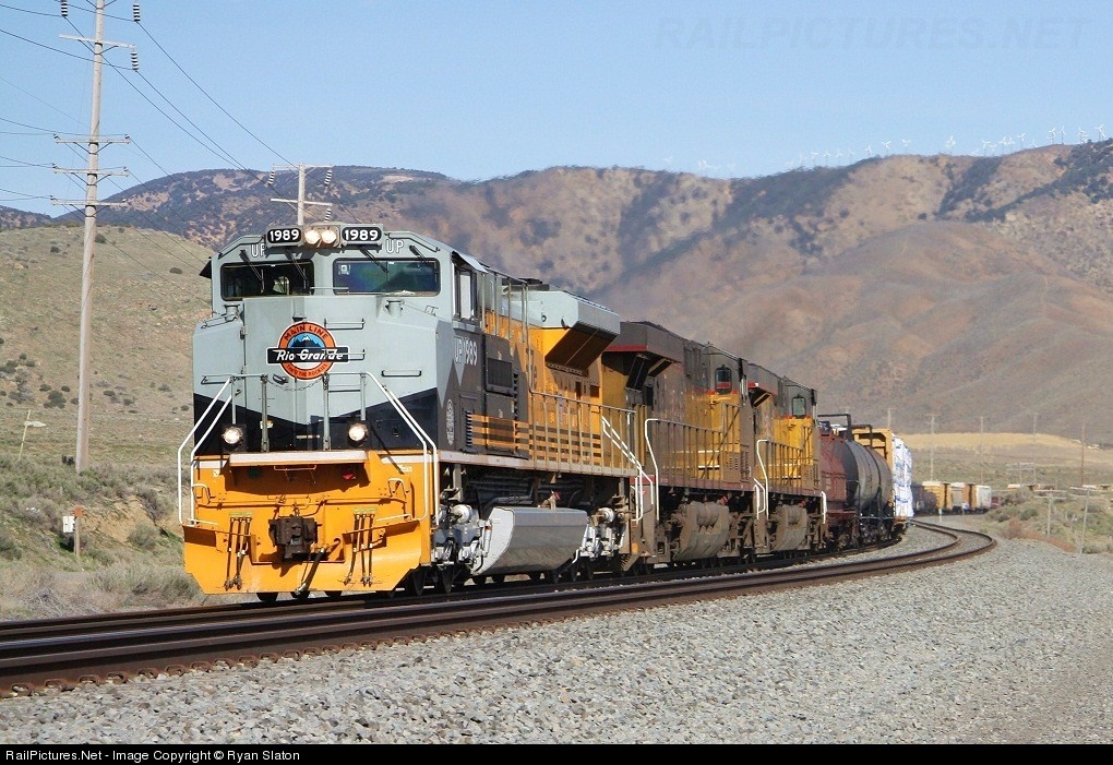 | UP 1989 battles up the eastern slope of the Tehachapi's with the West Colton to Fresno, CA manifest in tow. The train is heeling to the curves located just east of the Monolith cement plant. |