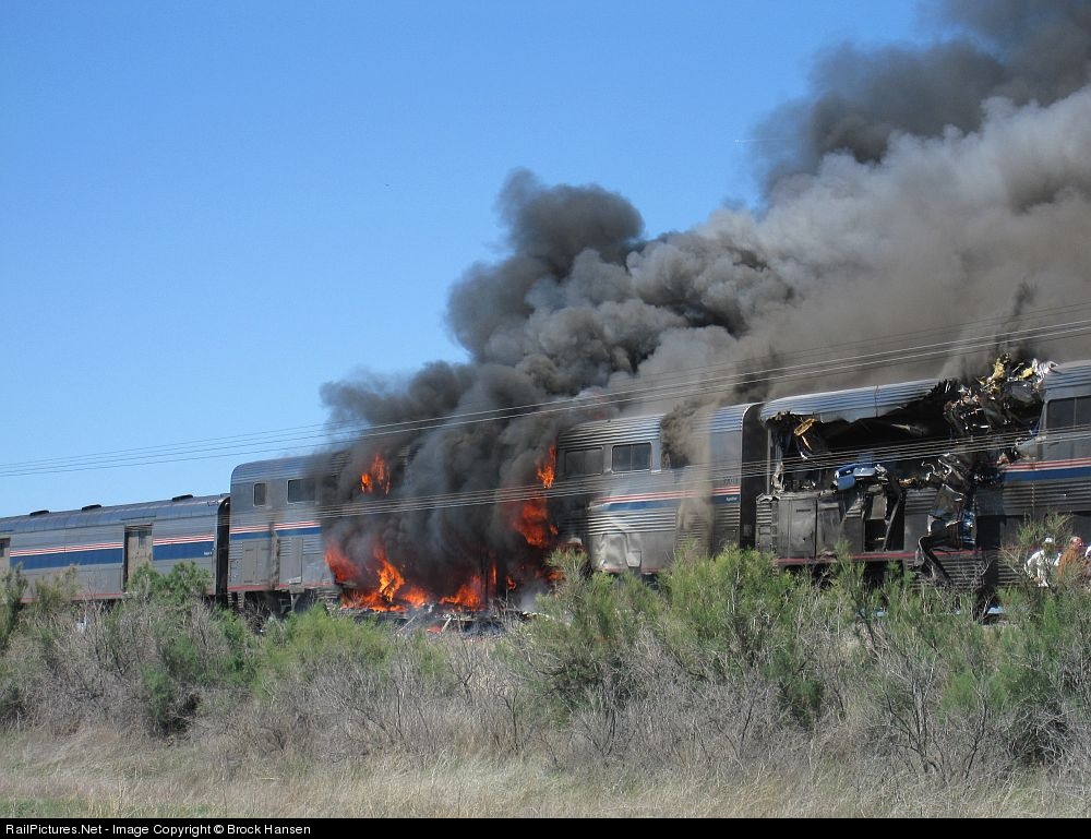 About 75 miles east of Reno Nevada. The westbound California Zephyr was struck by a empty gravel semi. I took this photo withen about 5 minutes of the train stopping. I ran to the front expecting to see damage to the unit. Not two superliners torn open with fire roaring in them. I was riding in the third superliner of this train. This view shows the start of the fire on the transition sleeper, and the coach is not yet fully engulfed in flames. The damage done by the truck is more or less clearly seen here. The remains of the truck are seen in this picture here