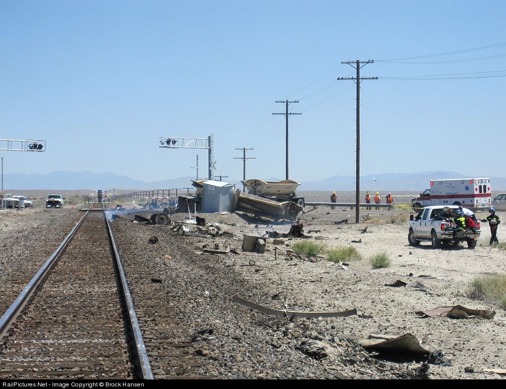 | About 75 miles east of Reno Nevada. The westbound California Zephyr was struck by a empty gravel semi. I ran to the front expecting to see damage to the unit. Not two superliners torn open with fire roaring in them. I was riding in the third superliner of this train. This view shows the crossing and the remains of the semi and its two trailers scattered all over. Also a UP westbound is shown waiting behind us. |