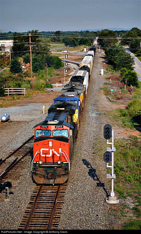 Waking Up to the Smell of Bacon, Canadian Bacon that is! NS 172 was sporting one heck of a colorful lash-up with not a single black & white in sight! A VERY rare 'Northern' visitor, CN 2243 leads another rare rival visitor, CSXT 7855, and the more common Western visitor, UP 5175! Here NS 172 is seen passing the signal at Motor as it is about to duck underneath the Highway 80 overpass I'm standing on. With this being my first CN unit on the point of a train, it was worth the trip back to my old stompin' grounds to chase NS 172