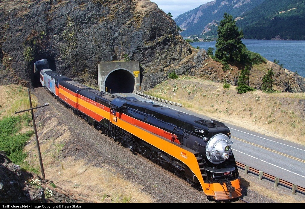 SP 4449 blasts out of the east portal of Tunnel 2, one of the liner-less tunnel portals on the former SP&S line. The train is racing along the Fallbridge Sub east of Drano lake, which can be seen in the upper right.