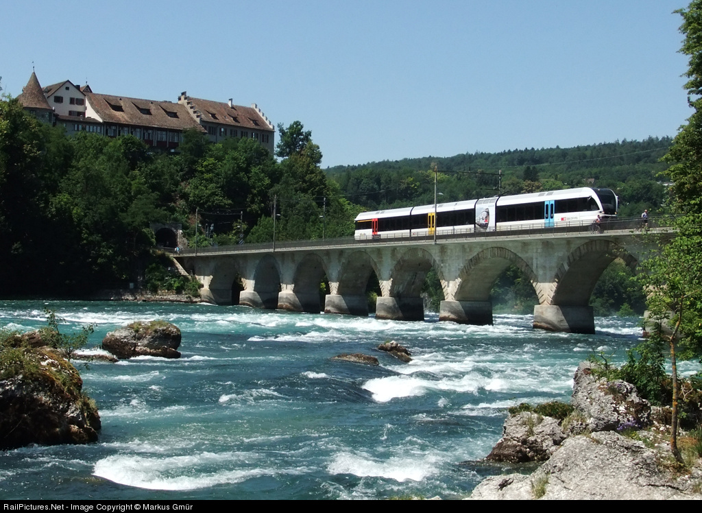 | Localtrain S33 from Winterthur to Schaffhausen near the waterfall "Rheinfall". It's also possible to crossing the bridge by feet. In the background the castle "Schloss Laufen" |