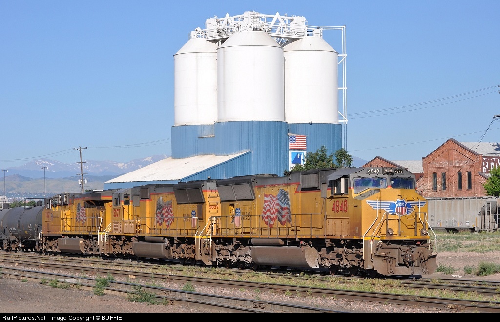 | UP 4848 and team moving past a grain elevator in Denver with flags waiving, on the 4th of July, 2011 |