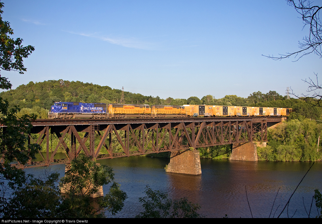 | Union Pacific Olympic Unit 2002 leads a matched train of yellow locomotives and box cars across the Chippewa River in Eau Claire, WI. |