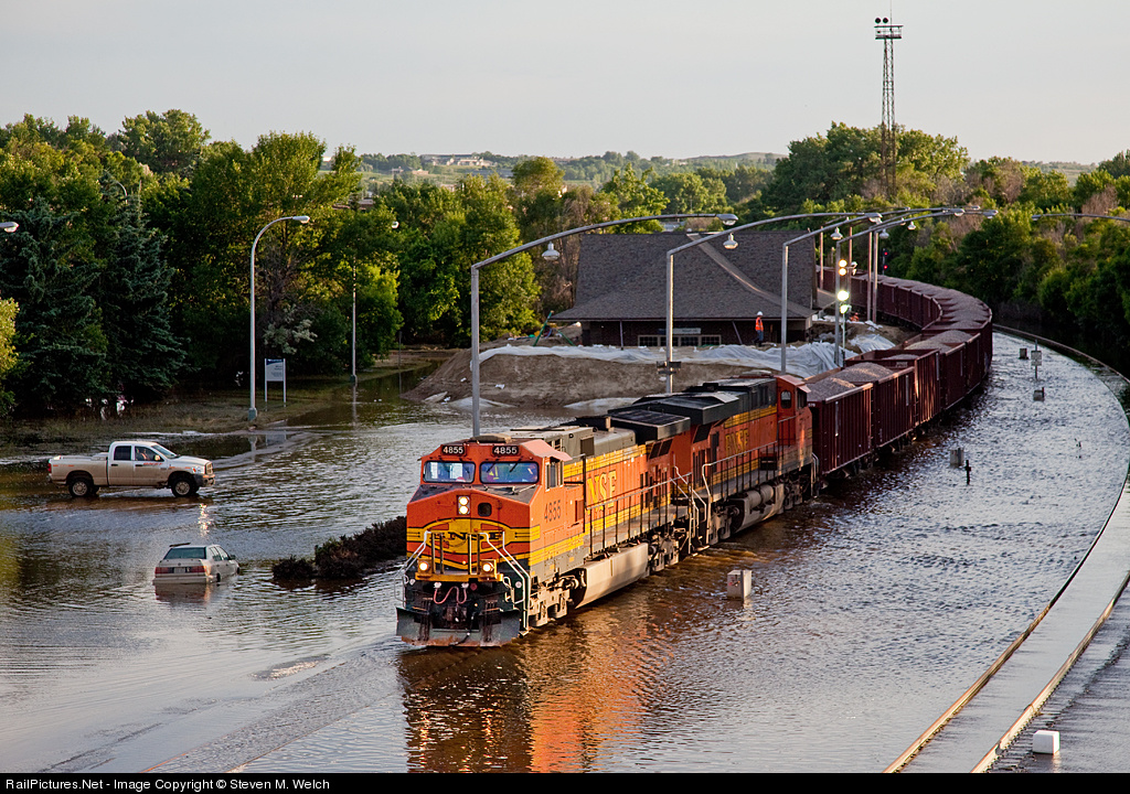 RJ Corman and dozens of BNSF employees spent their Fourth of July finishing up work on the flooded tracks through downtown Minot. After posting on their computers the tracks would be open at 20:00 on Monday the 4th, I expected the first train to be a Westbound Q. While running errands, getting stuff for the new house I'm living in (yes, it is high and dry), I heard the yard utility engineer being talked through a Form B, then mentioned they'll be shoving through Soo Tower. I knew right then, that whatever she was on, would be the first train through the flooded out KO and Glasgow Subdivisions. Around 19:00, BNSF 4855 and an ES44AC teamed up to swim through the high waters of the flooding Souris River and shove a 50-something car loaded ballast train West... The river has gone down, and just over ten days ago I posted a shot of the last train through Minot. Tracks washed away, dikes broke, and Minot will never be the same, and the newspaper today in town said "BNSF Railway opens tracks; last to close, first to open". I have to give a big thumbs up to all of my fellow BNSF co-workers and the RJ Corman team, along with the other contractors who helped re-open the Northern Transcon in such a quick time. Even though the trains are running, 4,000 homes are still under water; and 800+ will need to be demolished by the time the river drops...