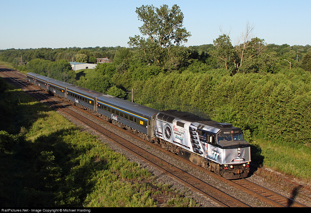 | While Americans enjoyed the 4th, it was just another workday in Canada and the evening train from Toronto is heading west with one of the two Coors Light Silver Bullet express special schemes on the point. |