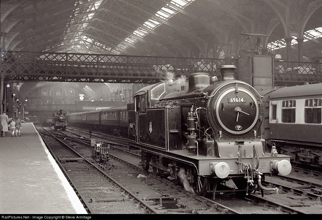 | In 1956 there occurred a rare (but most welcome) remembrance of the days of Edwardian splendour. The nationalised British Railways Eastern and North Eastern regions encouraged the restoration of a few of their veteran station pilots to pristine mechanical and external appearance. Captured by an unknown photographer is the 1924-built N7 0-6-2 tank of GE design that was chosen to receive the full treatment. She is emerging from the smoky and cavernous terminus of the former Great Eastern Railway at London's Liverpool Street Station. Deep in the shadows can just be seen the other recipient of pristine livery, a 1904-built Class J69 0-6-0 tank (one of the famed 'Jazz' engines). This latter locomotive No.68619 was also embellished with the lovely deep blue Great Eastern livery and featured a cab-side crest of that former company. A father with his two sons in typical 50s schoolboy garb have no doubt been enjoying these wonderful sights, alas now but a distant memory. York and Newcastle stations each had one similarly adorned 0-6-0 tank locomotive of North Eastern Railway Class J72 but these were liveried in LNER apple green. |
