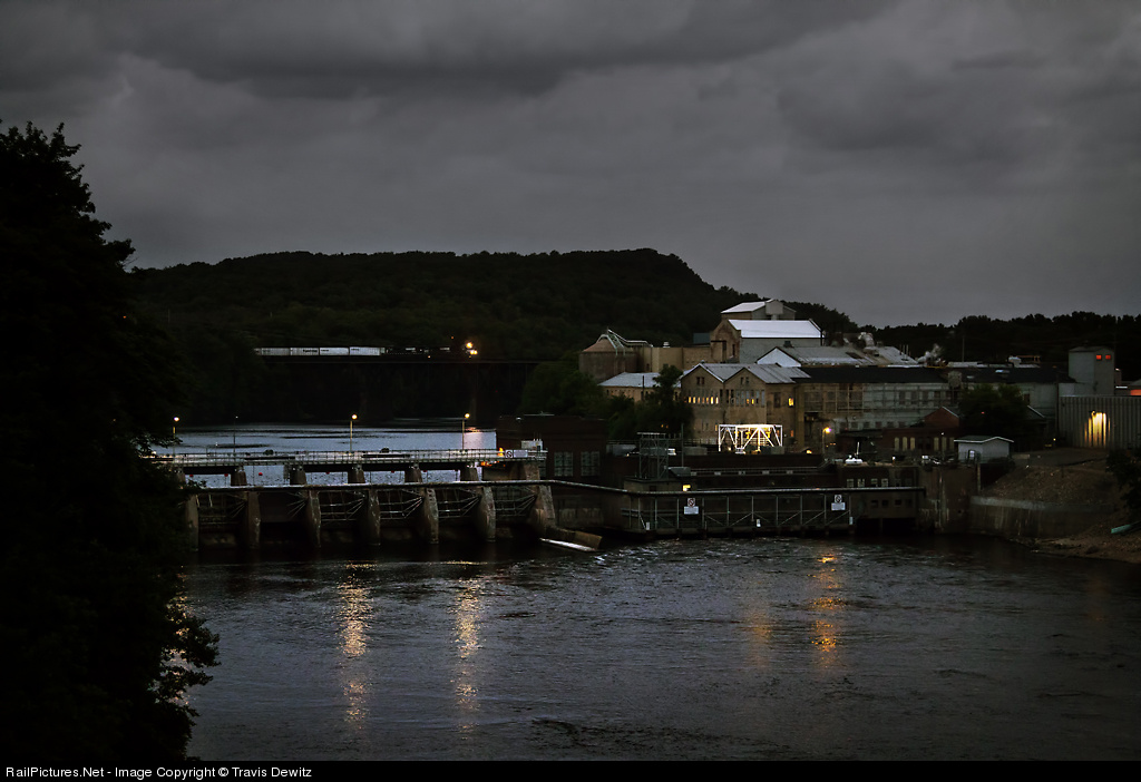 A low pressure front along with a thunderstorm are riding the heels of a late Triple Crown Roadrailertrain led by a pair of Norfolk Southern locomotives head across the Chippewa River in Eau Claire, Wisconsin. The dam holds back the river that form Dells Pond, which was designed to hold logs for all the saw mills in town. Cascade Tissue now sits above the dam.