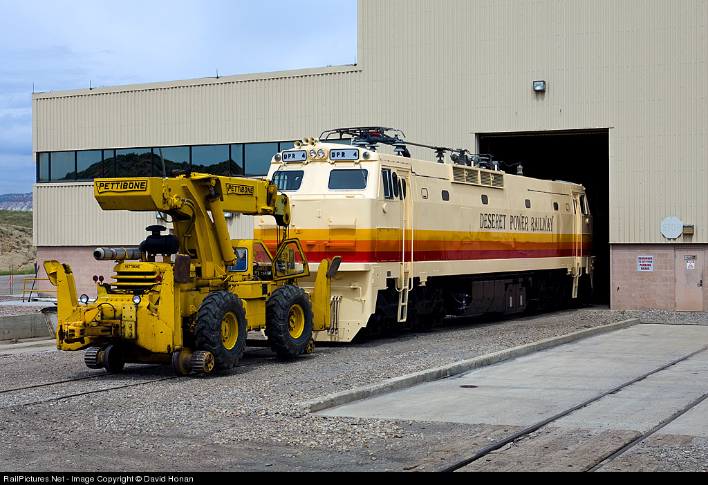 | The Deseret Power Railway's Pettibone crane drags freshly-painted DPR 4 into daylight for the first time. Unit 4 sports essentially the same paint scheme as Units 1 & 2, delivered new to the Deseret Western, but the railroad's name is displayed in a new font. Photo from railroad property taken with permission, supervision and while wearing proper PPE. |