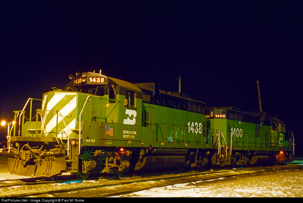 | A couple of BN GP10's are tied down for the night at BN's Eola Terminal one cold December night. |